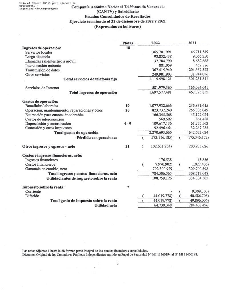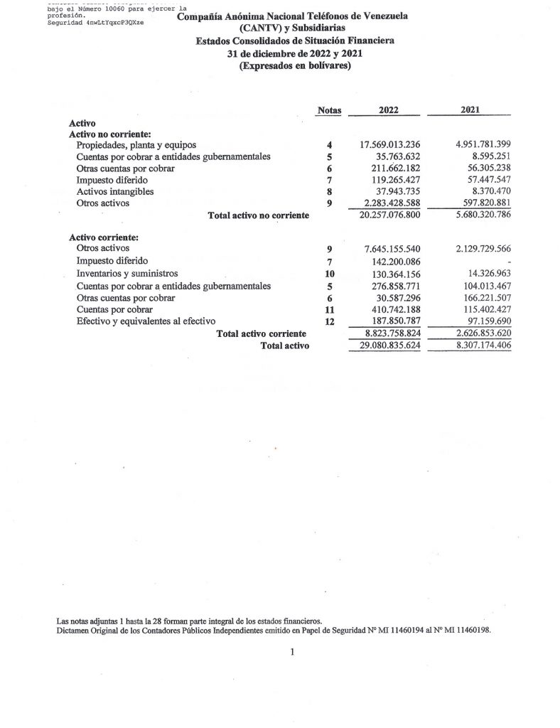 C.A. NACIONAL TELÉFONOS DE VENEZUELA (CANTV) INFORMACIÓN FINANCIERA DICIEMBRE 2022
