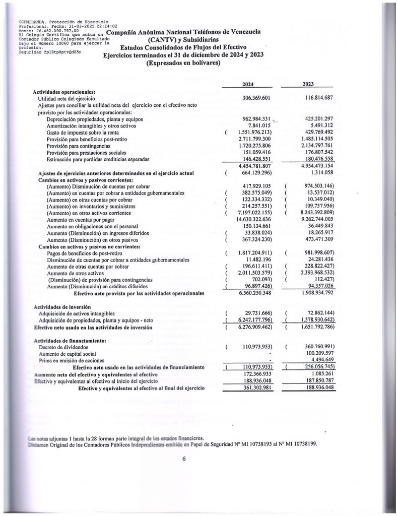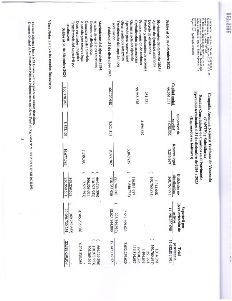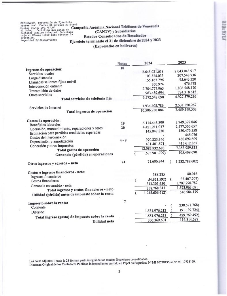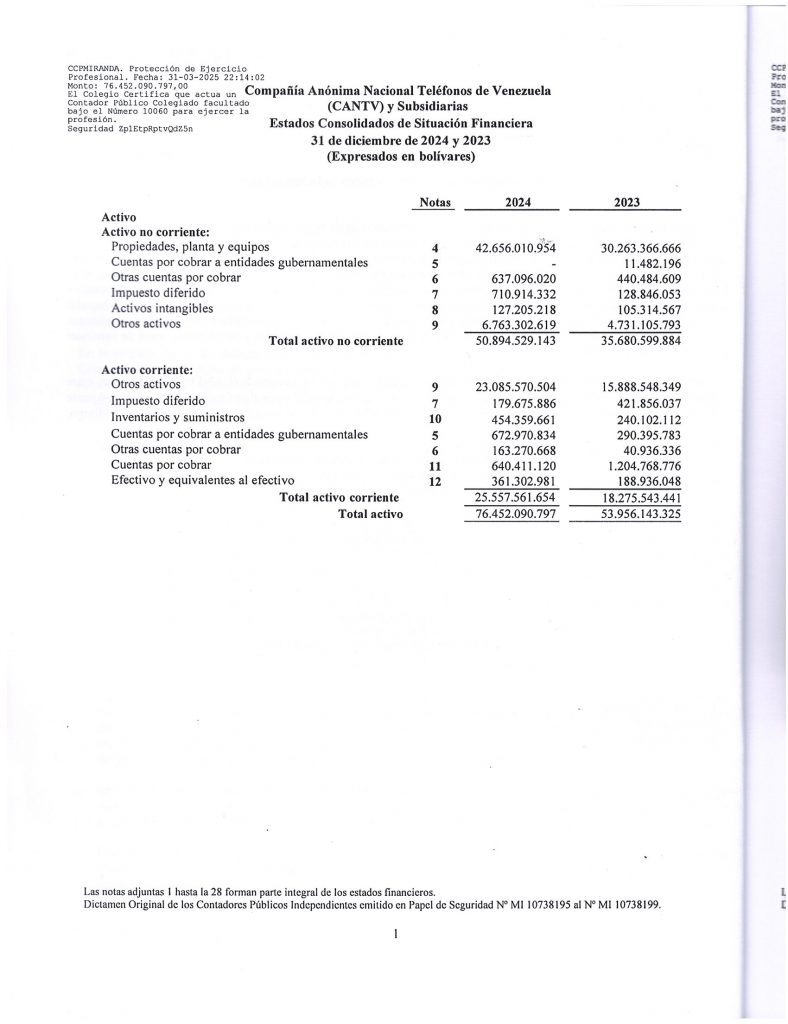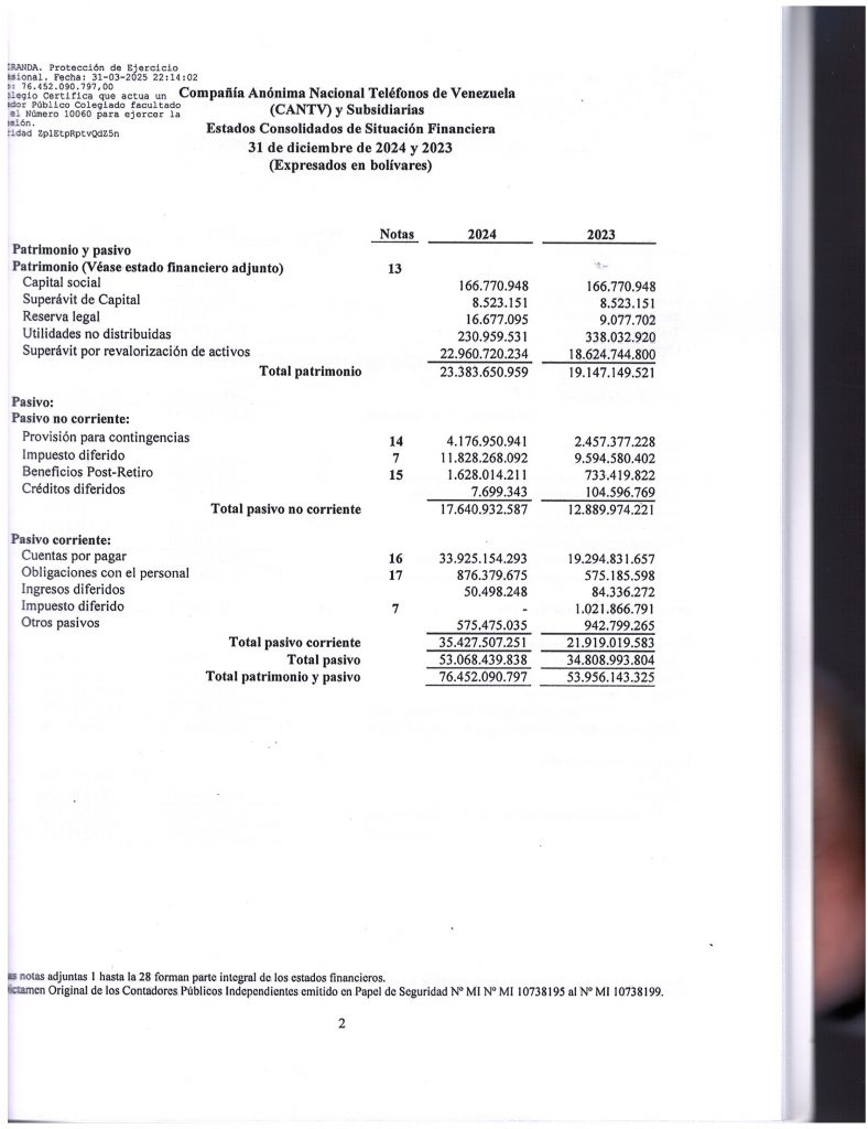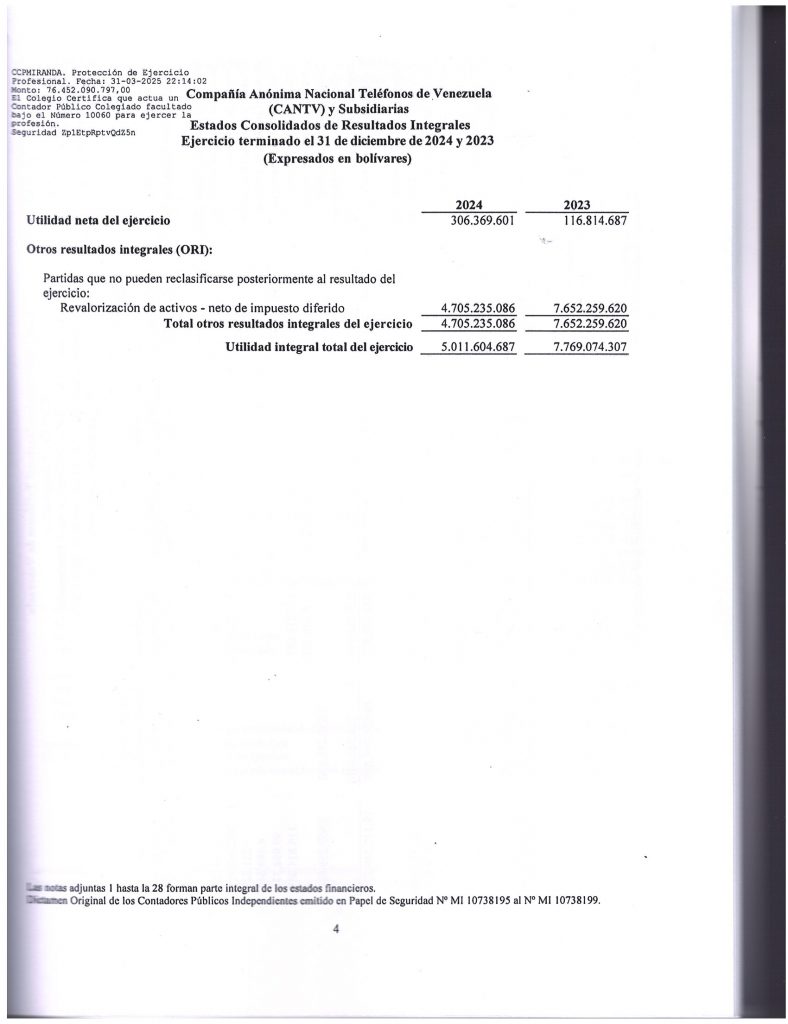 C.A. NACIONAL TELÉFONOS DE VENEZUELA (CANTV) INFORMACIÓN FINANCIERA DICIEMBRE 2024-2023 (AUDITADO)