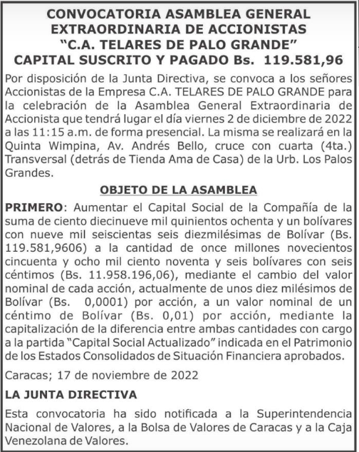 Por disposición de la Junta Directiva, se convoca a los señores Accionistas de la Empresa C.A. TELARES DE PALO GRANDE para la celebración de la Asamblea General Extraordinaria de Accionista que tendrá lugar el día viernes 2 de diciembre de 2022 a las 11:15 a.m de forma presencial. La misma se realizará en la Quinta Wimpina, Av. Andrés Bello, cruce con cuarto (4ta.) Transversal (detrás de Tienda Ama de Casa) de la Urb. Los Palos Grandes.