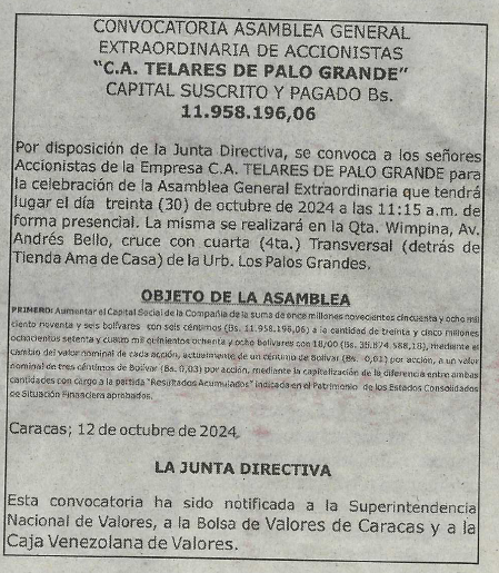 Por disposición de la Junta Directiva, se convoca a los señores Accionistas de la Empresa C.A. TELARES DE PALO GRANDE para la celebración de la Asamblea General Extraordinaria que tendrá lugar el día treinta (30) de octubre de 2024 a las 11:15 a.m. de forma presencial. La misma se realizará en la Qta. Wimpina, Av. Andrés Bello, cruce con cuarta (4ta.) Transversal (detrás de Tienda Ama de Casa) de la Urb. Los Palos Grandes,