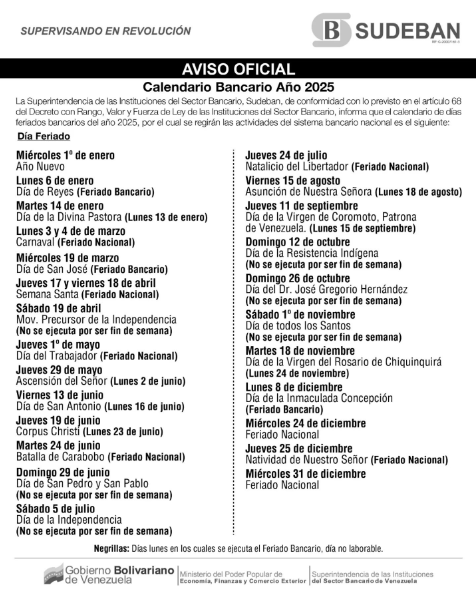 La Superintendencia de las Instituciones del Sector Bancario (SUDEBAN) publicó el calendario que regirá las operaciones bancarias para el año 2025.