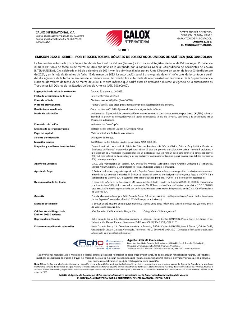 Los títulos para colocar son los correspondientes a la Serie I, de la Emisión 2022-II, por un monto de (USD 300.000,00), de Papeles Comerciales al Portador, emitido por la Empresa Emisora CALOX INTERNATIONAL, C.A.