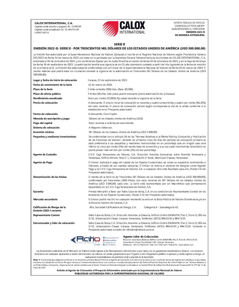 CALOX INTERNATIONAL, C.A., EMISIÓN 2022-II PAPELES COMERCIALES TOTALMENTE GARANTIZADOS AL PORTADOR