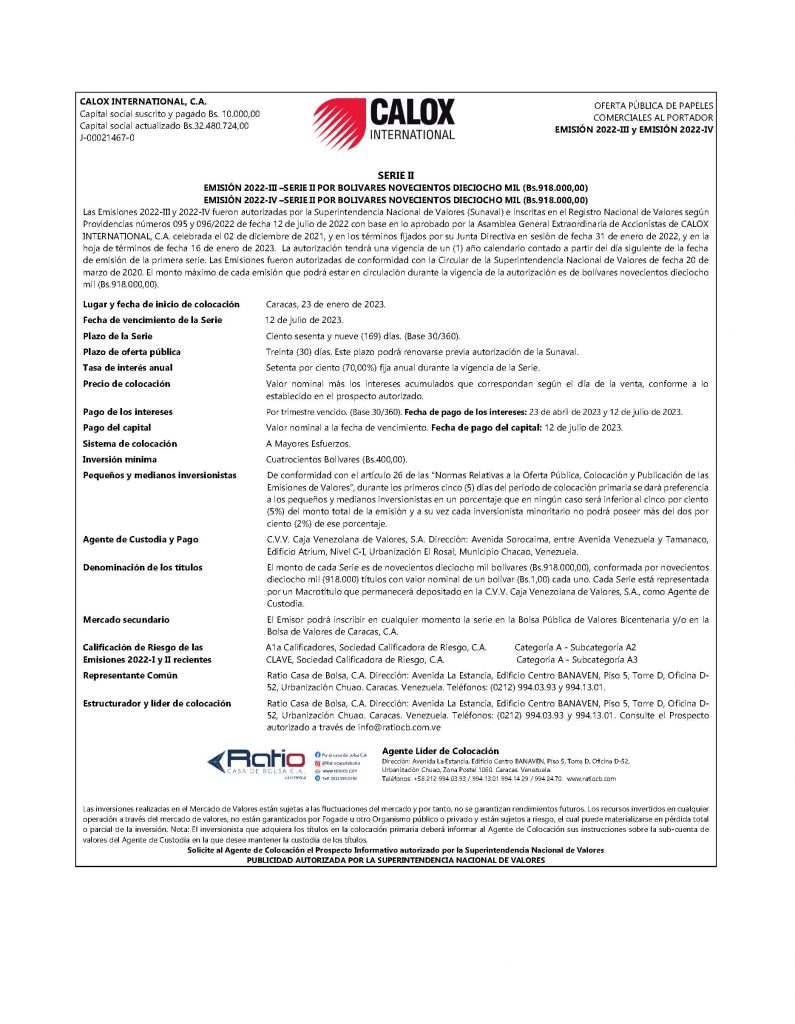 Los títulos para colocar son los correspondientes a la Serie II, de las Emisiones 2022-III, y 2022-IV, de Papeles Comerciales al Portador, emitidos por la Empresa Emisora CALOX INTERNATIONAL, C.A.