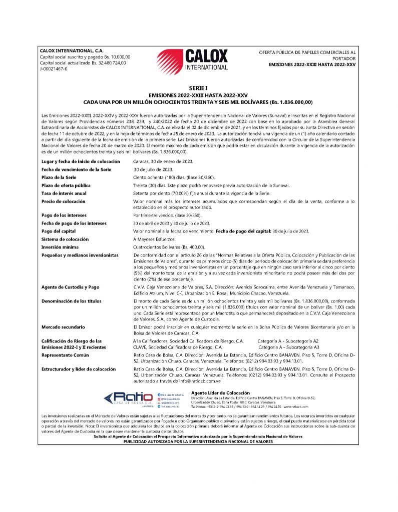 Los títulos para colocar son los correspondientes a la Serie I, de las Emisiones 2022-XXIII, 2022-XXIV y 2022-XXV, de Papeles Comerciales al Portador, emitidos por la Empresa Emisora CALOX INTERNATIONAL, C.A.