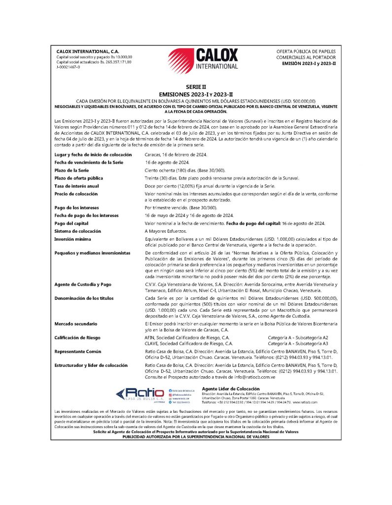 Los títulos para colocar son los correspondientes a la Serie II, de las Emisiones 2023-I y 2023-II, de Papeles Comerciales al Portador, emitidos por la Empresa Emisora CALOX INTERNATIONAL, C.A.