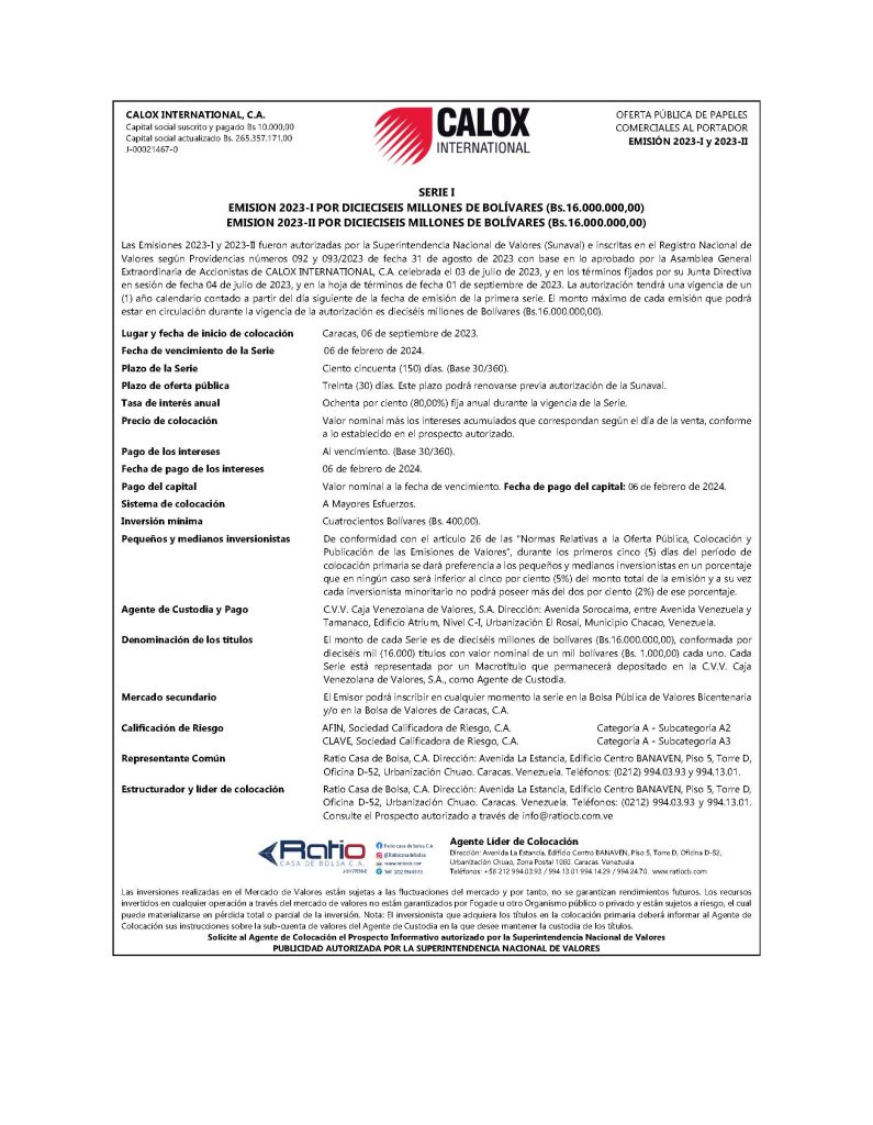 | Emisor | CALOX INTERNATIONAL, C.A. |
