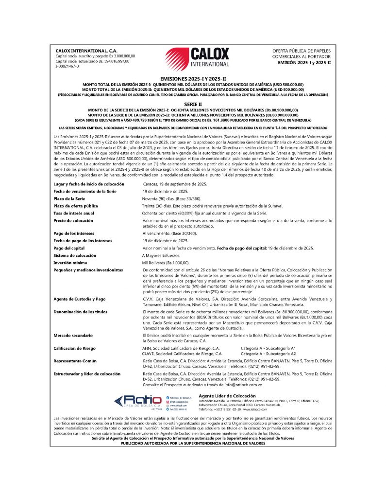 Los títulos para colocar son los correspondientes a la Serie II, de las Emisiones 2025-I y 2025-II, de Papeles Comerciales al Portador, emitidos por la Empresa Emisora CALOX INTERNATIONAL, C.A.