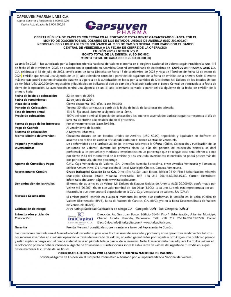 | Emisor | CAPSUVEN PHARMA LABS, C. A. |