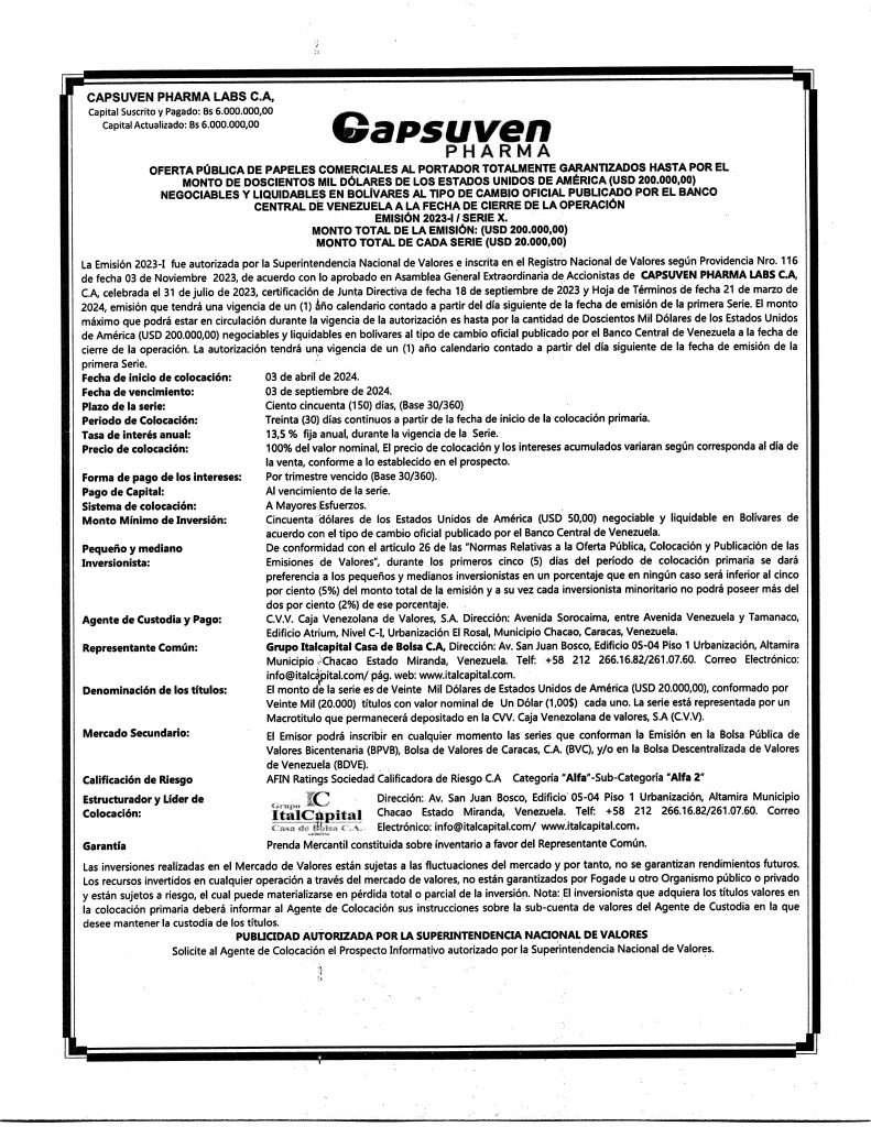 | Emisor | CAPSUVEN PHARMA LABS, C. A. |