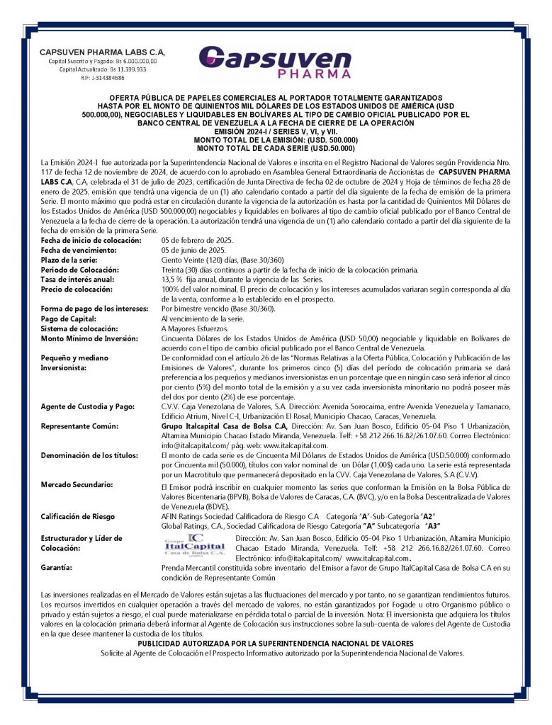 Los títulos para colocar son los correspondiente a la Series V, VI y VII, de la Emisión 2024-I, de Papeles Comerciales al Portador, emitidos por la Empresa Emisora CAPSUVEN PHARMA LABS, C. A., con denominación en dólares de los Estados Unidos de América (USD$). Negociable y Liquidables en Bolívares.
