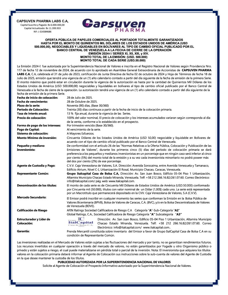 CAPSUVEN PHARMA LABS, C. A., EMISIÓN 2024-I SERIES XI, XII, XIII y XIV PAPELES COMERCIALES AL PORTADOR TOTALMENTE GARANTIZADOS