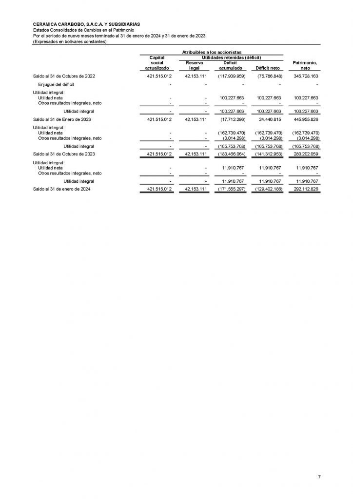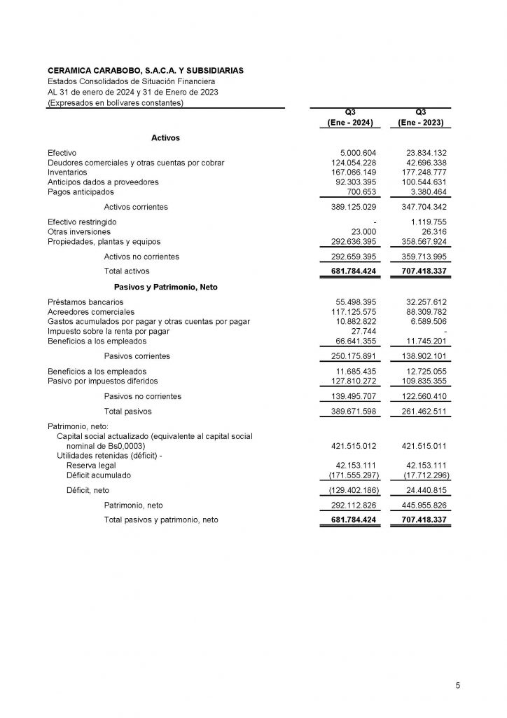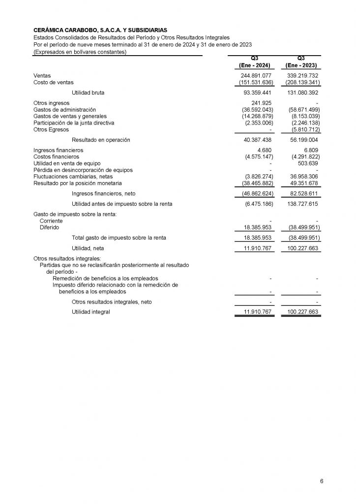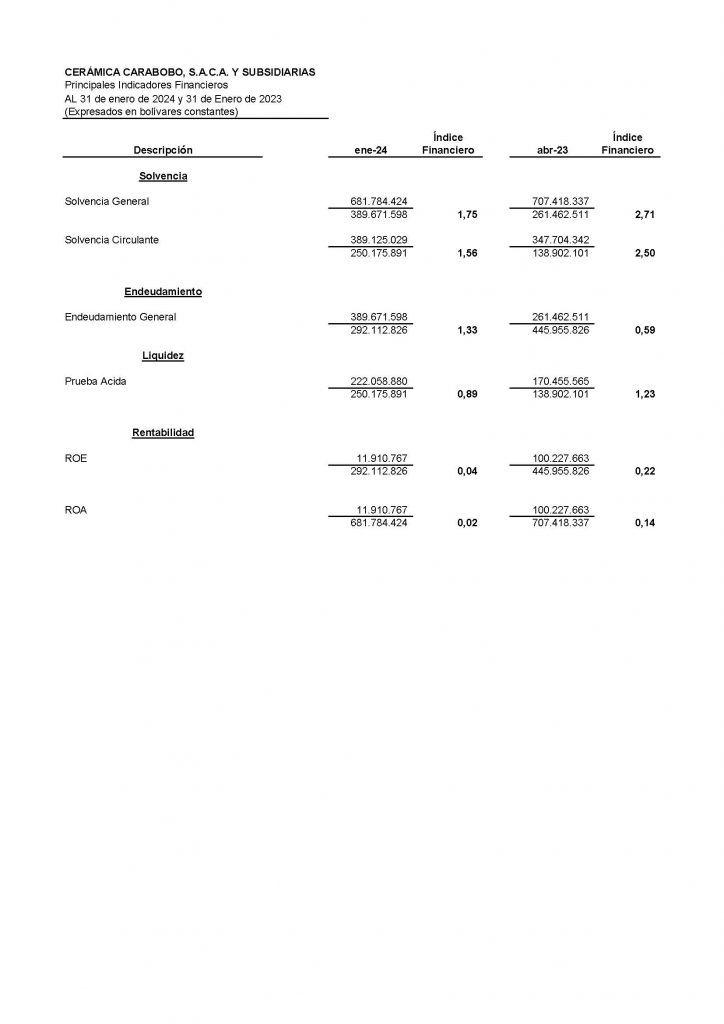 Estados Consolidados de Situación Financiera, Estados Consolidados de Resultados del Período y Otros Resultados Integrales, Estados Consolidados de cambios en el Patrimonio, y Principales Indicadores Financieros al 31 de Enero de 2024 comparativo con el 31 de Enero de 2023 de CERAMICA CARABOBO S.A.C.A