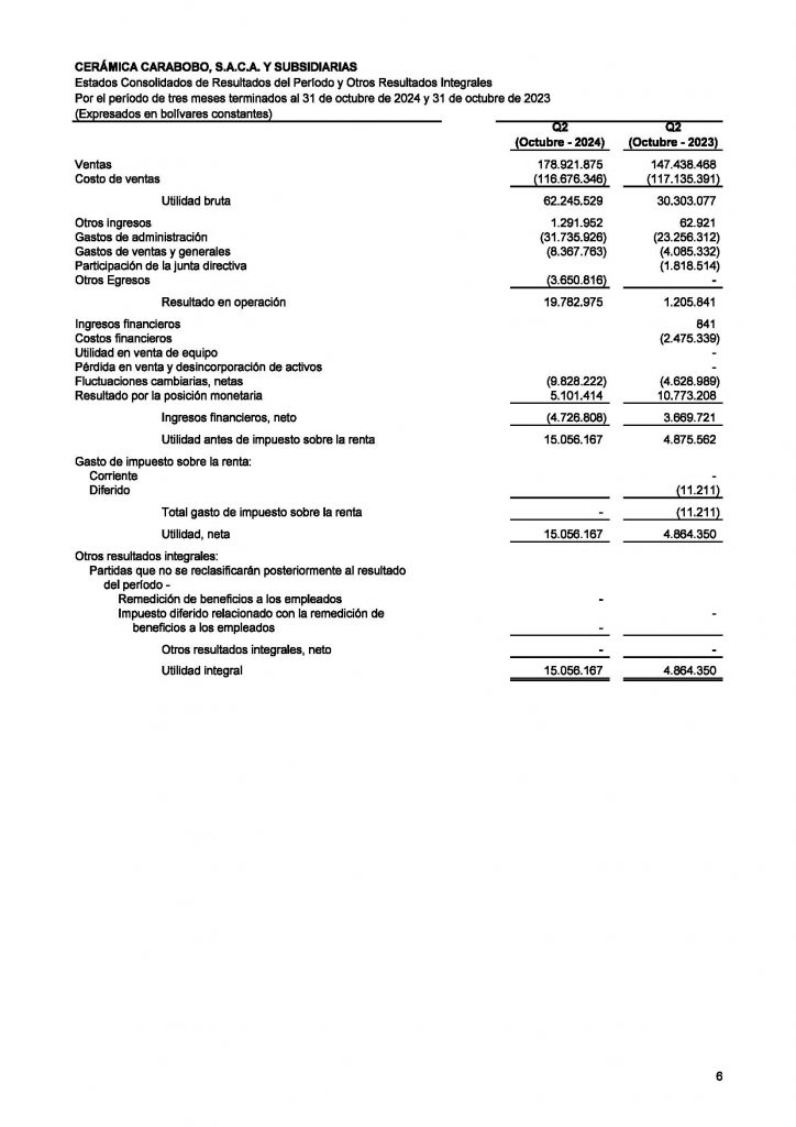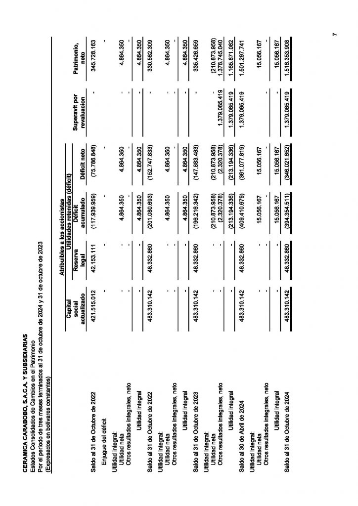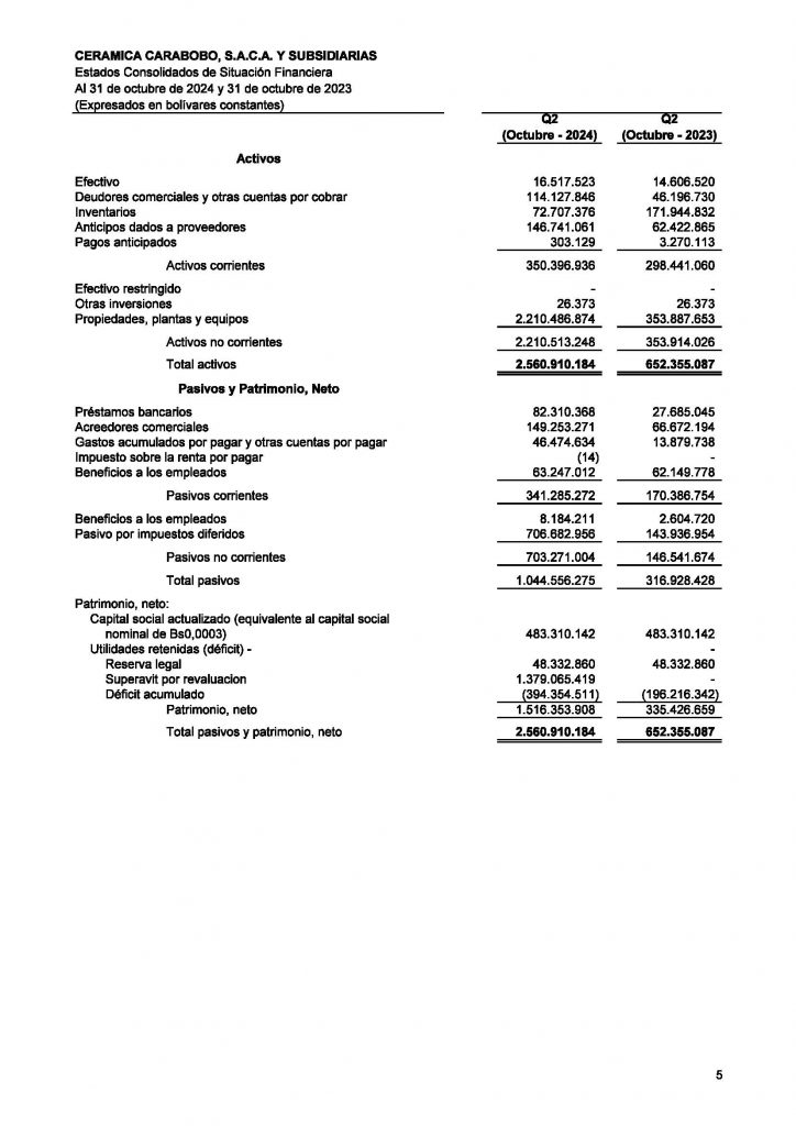 Estados Consolidados de Situación Financiera, Estados Consolidados de Resultados del Período y Otros Resultados Integrales, Estados Consolidados de cambios en el Patrimonio, y Principales Indicadores Financieros al 31 de Octubre de 2024 comparativo con el 31 de Octubre de 2023 de CERAMICA CARABOBO S.A.C.A
