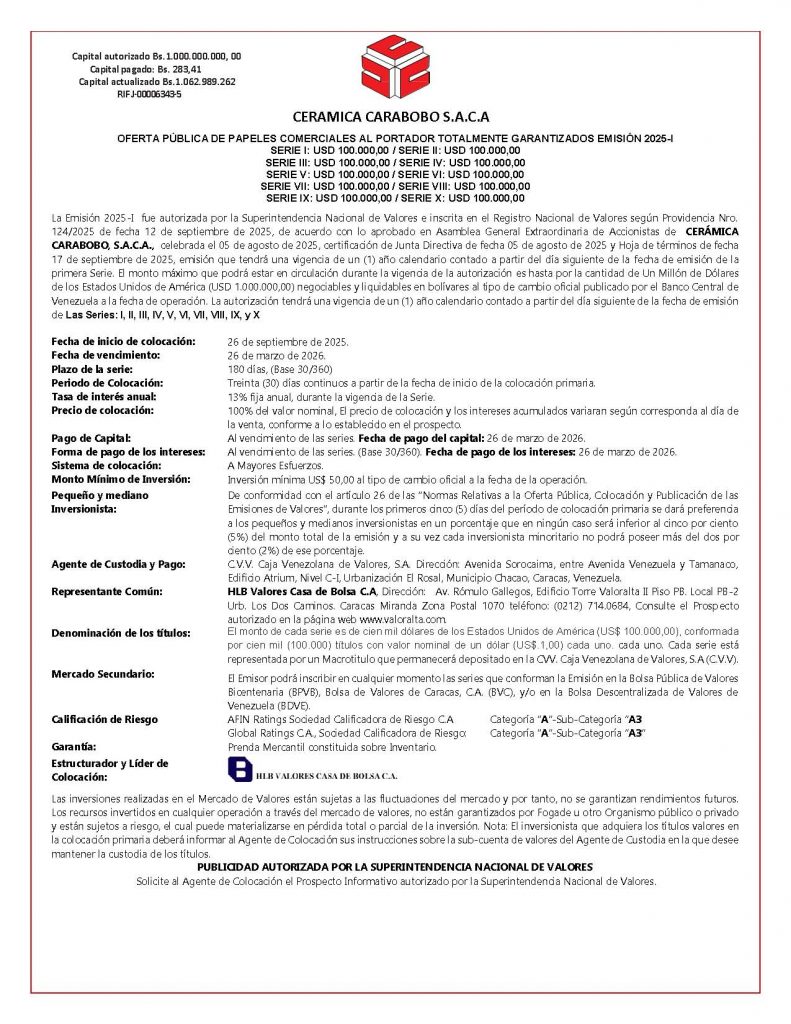 Colocación Primaria de Papeles Comerciales al Portador Totalmente Garantizados Emisión 2025-I Serie I Monto USD$ 100.000,00, Emisión 2025-I Serie II Monto USD$ 100.000,00, Emisión 2025-I Serie III Monto USD$ 100.000,00, Emisión 2025-I Serie IV Monto USD$ 100.000,00, Emisión 2025-I Serie V Monto USD$ 100.000,00, Emisión 2025-I Serie VI Monto USD$ 100.000,00, Emisión 2025-I Serie VII Monto USD$ 100.000,00, Emisión 2025-I Serie VIII Monto USD$ 100.000,00, Emisión 2025-I Serie IX Monto USD$ 100.000,00 Y Emisión 2025-I Serie X Monto USD$ 100.000,00 negociables y liquidables en bolívares al tipo de cambio oficial publicado por el Banco Central de Venezuela a la fecha de operación