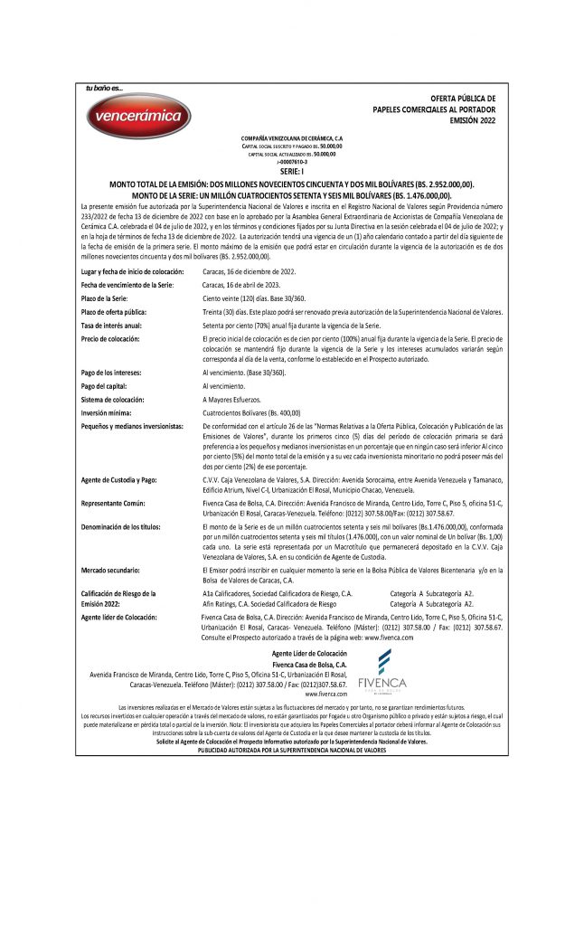 COMPAÑÍA VENEZOLANA DE CERAMICA, C. A. (VENCERAMICA). EMISIÓN 2022 PAPELES COMERCIALES AL PORTADOR