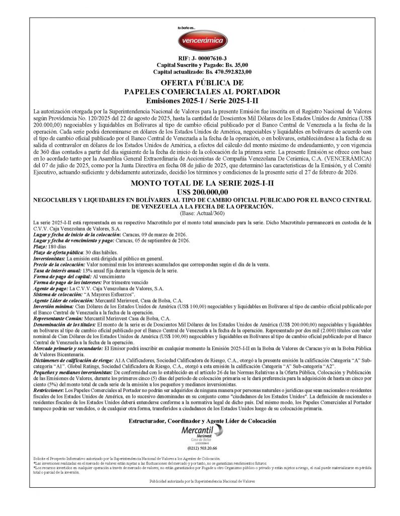 Los títulos para colocar son los correspondiente a la Serie 2025-I-II, de la Emisión 2025-I, de Papeles Comerciales al Portador, emitidos por la Empresa Emisora COMPAÑÍA VENEZOLANA DE CERAMICA, C. A. (VENCERAMICA). Negociables y liquidables en bolívares.