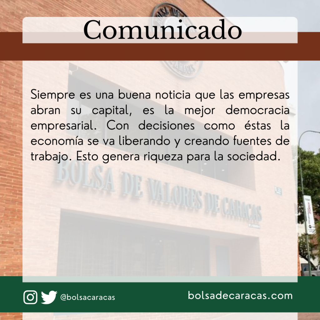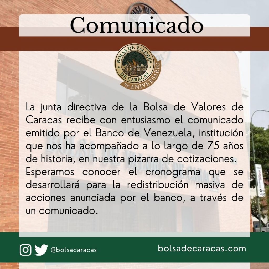 La junta directiva de la Bolsa de Valores de Caracas recibe con entusiasmo el comunicado emitido por el Banco de Venezuela, institución que nos ha acompañado a lo largo de 75 años de historia, en nuestra pizarra de cotizaciones.