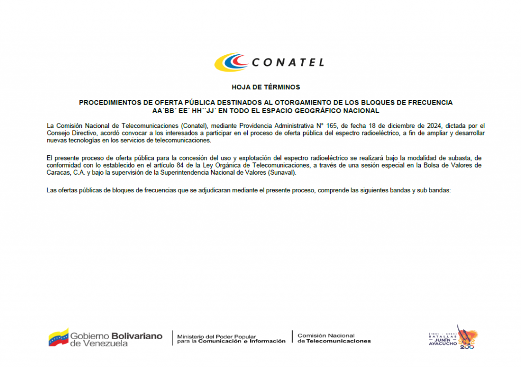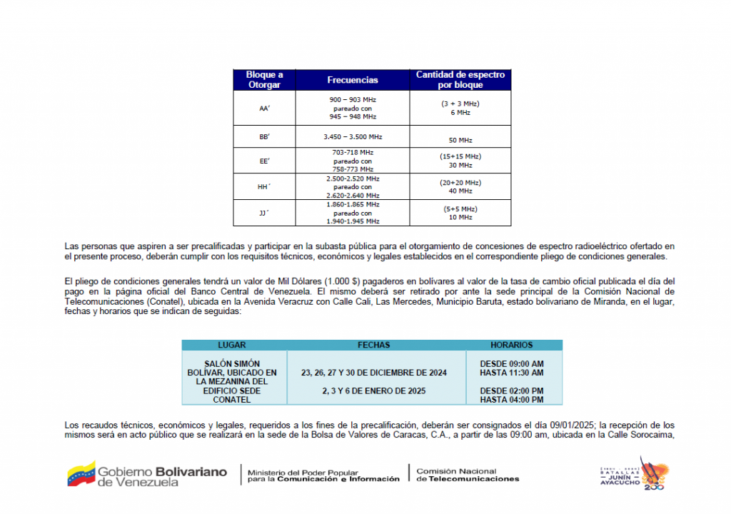 De acuerdo con la información publicada por CONATEL, las empresas interesadas en participar en la oferta pública de los bloques de frecuencia deberán adquirir el Pliego de Condiciones Generales con los requerimientos técnicos, económicos y legales, en la sede del organismo de telecomunicaciones, entre el 23 de diciembre y el 6 de enero.