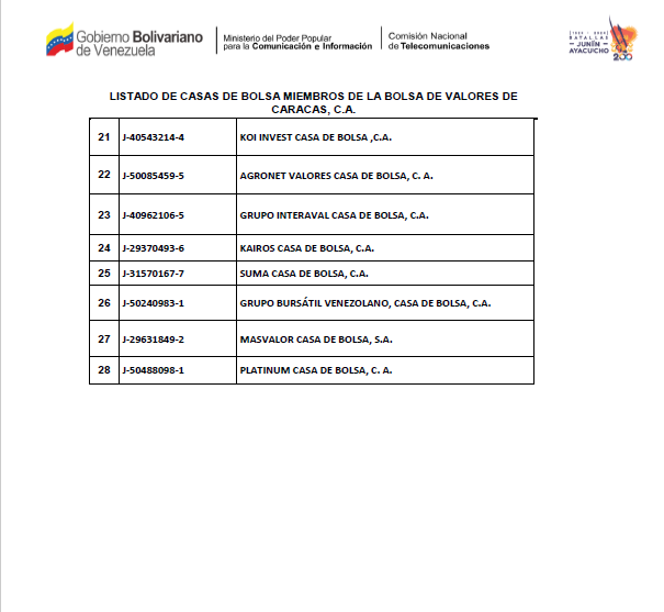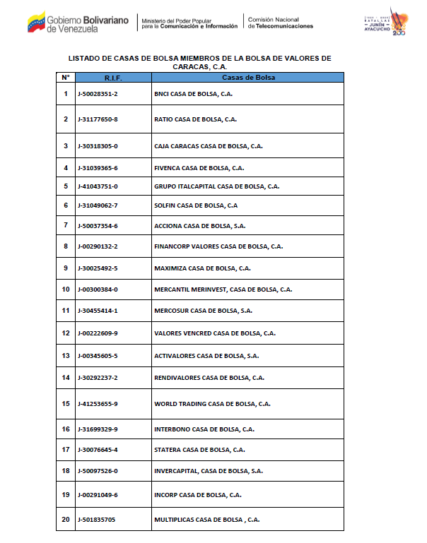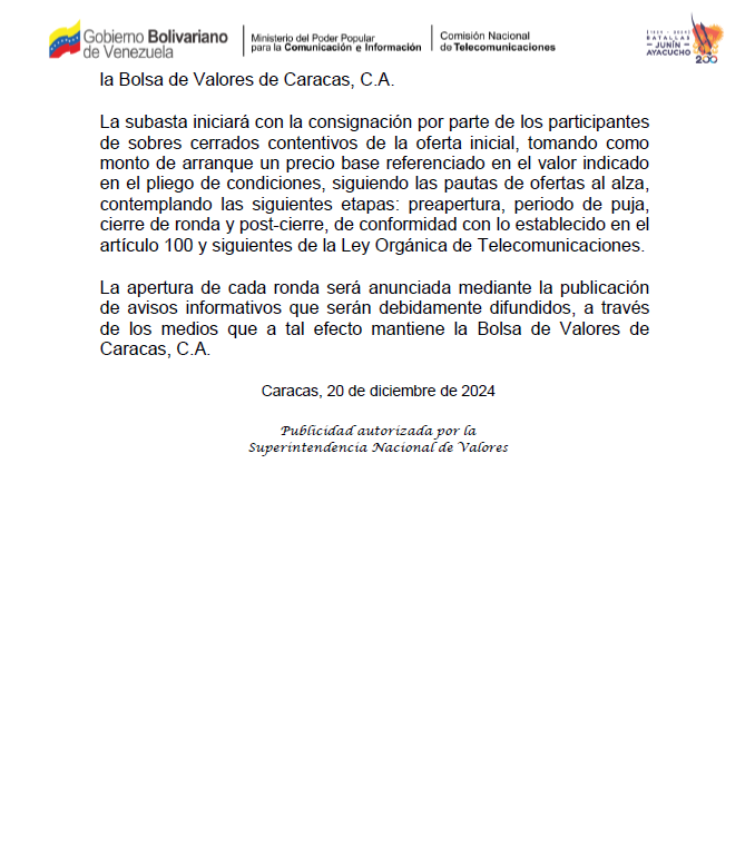 La Bolsa de Valores de Caracas, cumpliendo con su misión de servir al mercado de valores venezolano de forma ordenada, transparente, segura y confiable, y por solicitud de la Superintendencia Nacional de Valores (SUNAVAL), será la plataforma para la realización de la Oferta Pública para el otorgamiento de los bloques de frecuencia en el espacio geográfico nacional convocada por la Comisión Nacional de Telecomunicaciones (CONATEL), este viernes, 20 de diciembre.