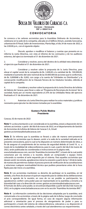 Nota 1: La documentación a ser considerada en la asamblea, estará a disposición de los señores accionistas a partir del día 8 de marzo de 2022, en el departamento de Gestión de Accionistas de la Bolsa de Valores de Caracas C.A., Email: gestion.accionistas@bolsadecaracas.com