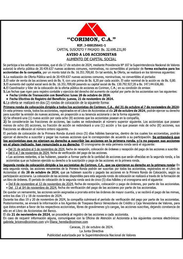 Se participa a los señores accionistas, que el día 17 de octubre de 2024, mediante Providencia Nro. 107 la Superintendencia Nacional de Valores autorizó la oferta pública de 20.439.637 nuevas acciones comunes, nominativas, no convertibles al portador de forma exclusiva para los accionistas de la compañía, por un monto total de Bs. 16.351.709,60. En tal sentido, la Oferta, se realizará en los términos siguientes: