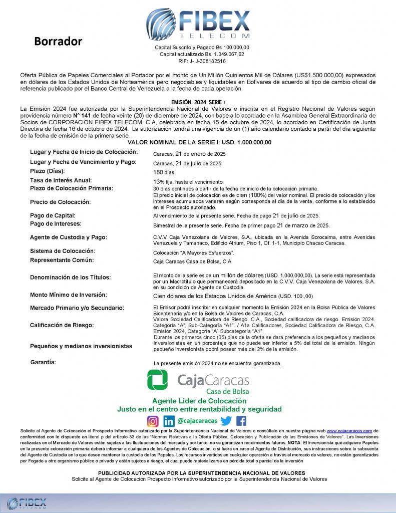 Los títulos para colocar son los correspondientes a la Serie I, de la Emisión 2024, de Papeles Comerciales de CORPORACIÓN FIBEX TELECOM, C.A., con denominación en dólares de los Estados Unidos de América (USD$).