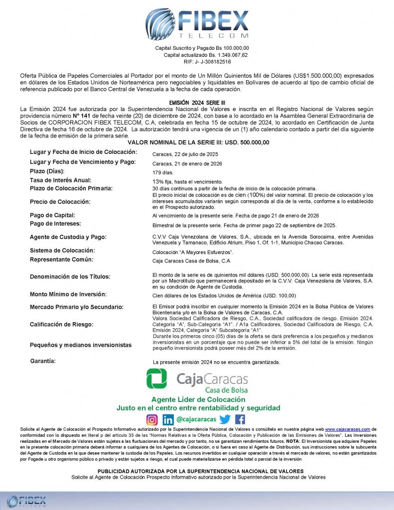 Los títulos para colocar son los correspondientes a la Serie III, de la Emisión 2024, de Papeles Comerciales de CORPORACIÓN FIBEX TELECOM, C.A., con denominación en dólares de los Estados Unidos de América (USD$). Negociables y liquidables en bolívares.