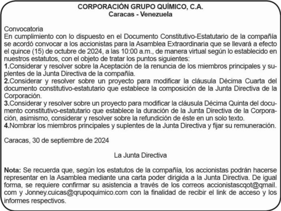 En cumplimiento con lo dispuesto en el Documento Constitutivo-Estatutario de la compañía se acordó convocar a los accionistas para la Asamblea Extraordinaria que se llevará a efecto el quince (15) de octubre de 2024, a las 10:00 a.m., de manera virtual según lo establecido en nuestros estatutos, con el objeto de tratar los puntos siguientes: