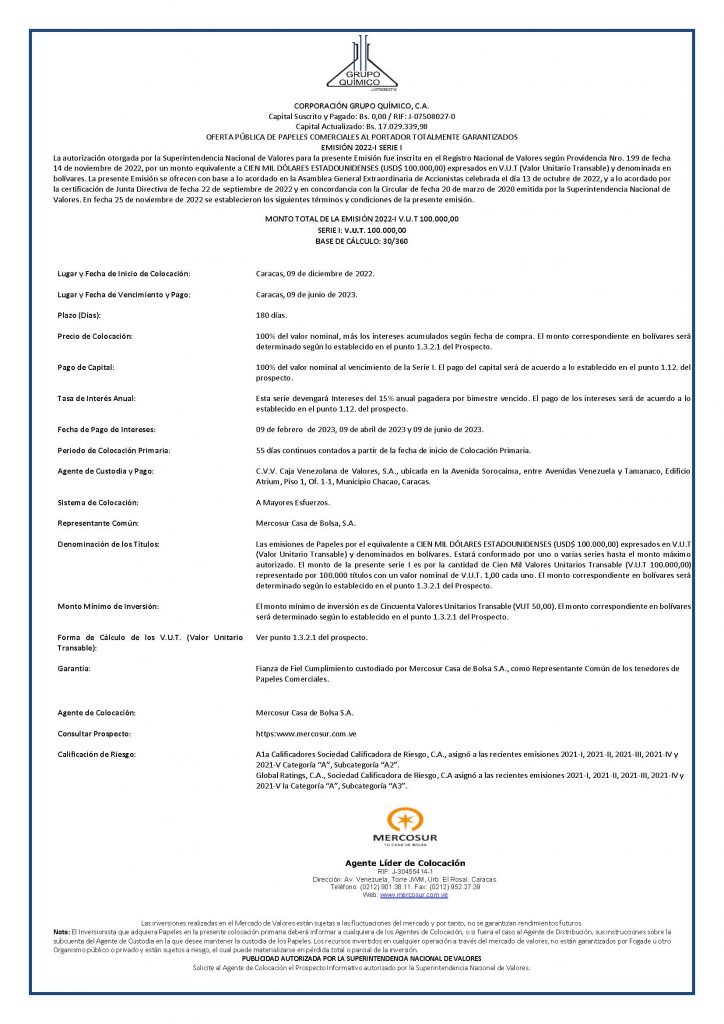 CORPORACION GRUPO QUIMICO, C.A., EMISIÓN 2022-I Y EMISIÓN 2022-II, PAPELES COMERCIALES AL PORTADOR TOTALMENTE GARANTIZADOS