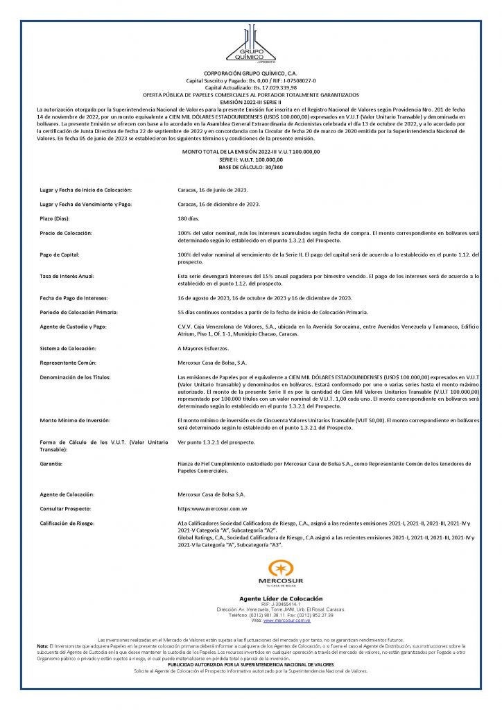 Los títulos hacer colocados son los correspondientes a la Serie II, de la Emisiones 2022-III, 2022-IV y 2022-V, de Papeles Comerciales al Portador, emitidos por la Empresa Emisora CORPORACION GRUPO QUIMICO, C.A. con un monto (USD$ 100.000,00) c/u, en dólares de los Estados Unidos de América y expresados en V.U.T. (Valor Unitario Transable).