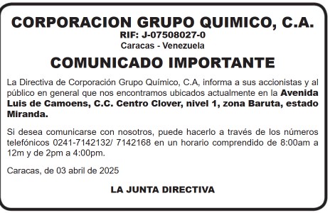 La Directiva de Corporación Grupo Químico, C.A., informa a sus accionistas y al público en general su ubicación actual.