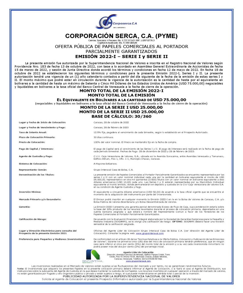 Los títulos para colocar son los correspondientes a la Serie I y Serie II, de la Emisión 2022-I, de Papeles Comerciales al Portador, emitidos por la Empresa Emisora CORPORACION SERCA, C. A.