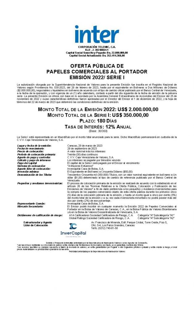 Los títulos para colocar son los correspondientes a la Serie I, de la Emisión 2022, de Papeles Comerciales de CORPORACIÓN TELEMIC, C.A., con denominación en dólares de los Estados Unidos de América (USD$).