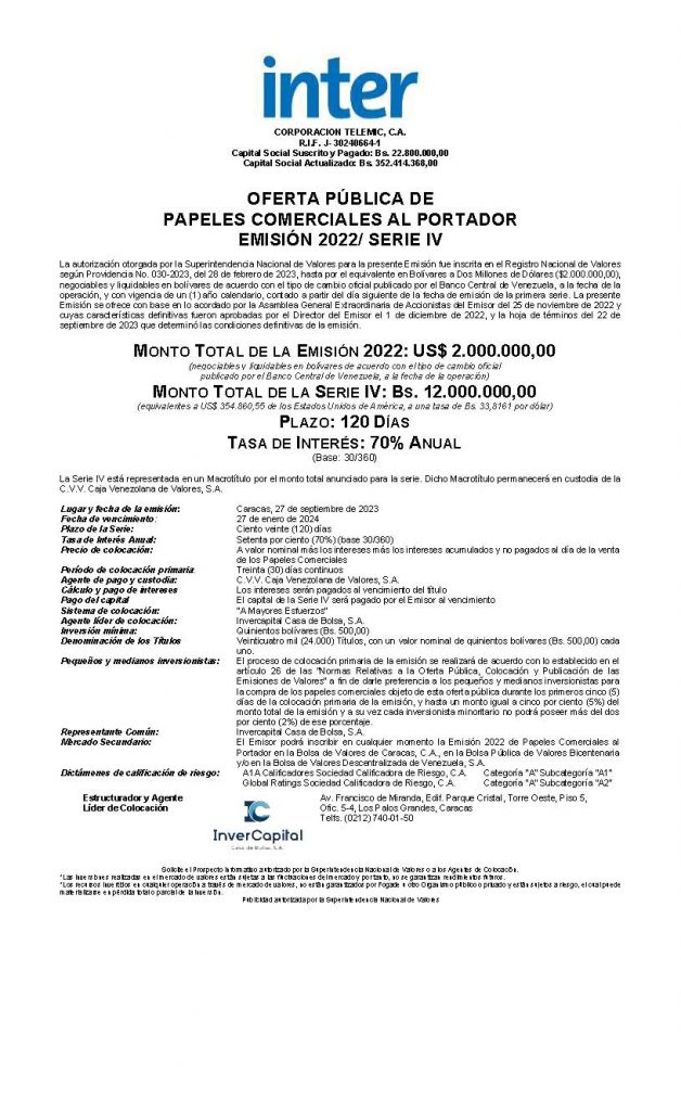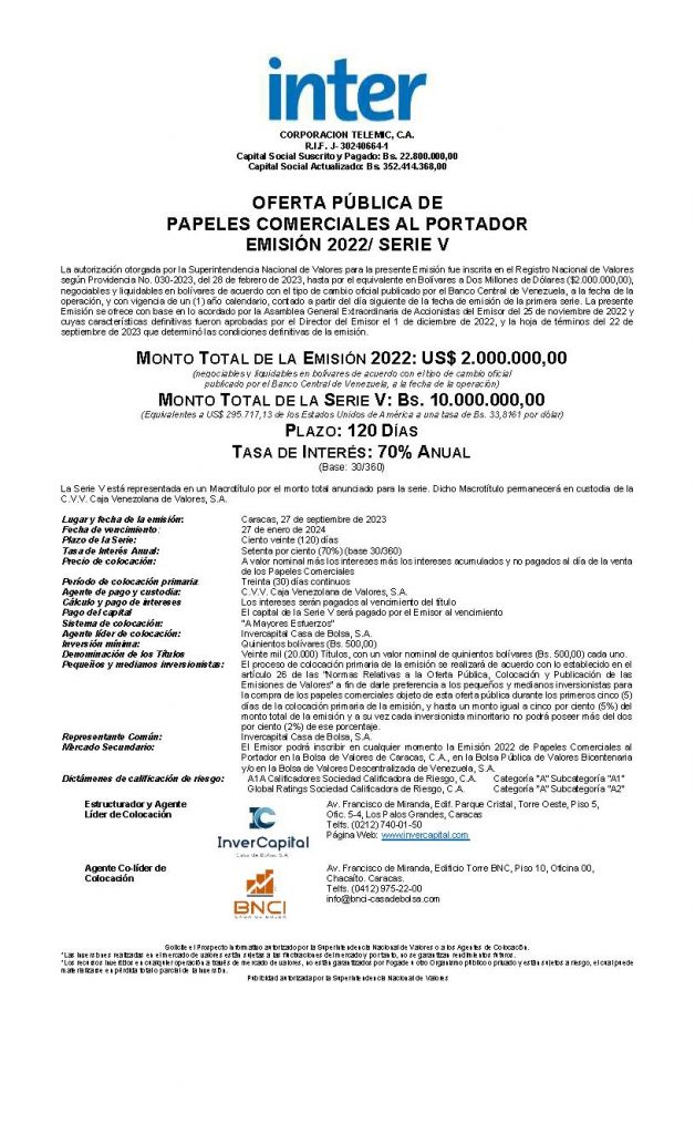 Los títulos para colocar son los correspondientes a las Series IV, V y VI, de la Emisión 2022, de Papeles Comerciales de CORPORACIÓN TELEMIC, C.A.