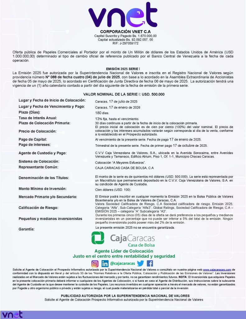 Los títulos para colocar son los correspondientes a la Serie I, de la Emisión 2025, de Papeles Comerciales de CORPORACIÓN VNET, C.A., con denominación en dólares de los Estados Unidos de América (USD$). Negociables y liquidables en bolívares.