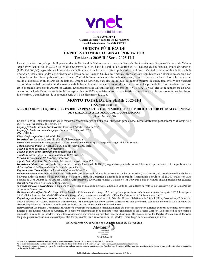 Los títulos para colocar son los correspondientes a la Serie 2025-II-I, de la Emisión 2025-II, de Papeles Comerciales de CORPORACIÓN VNET, C.A., con denominación en dólares de los Estados Unidos de América (USD$). Negociables y liquidables en bolívares.