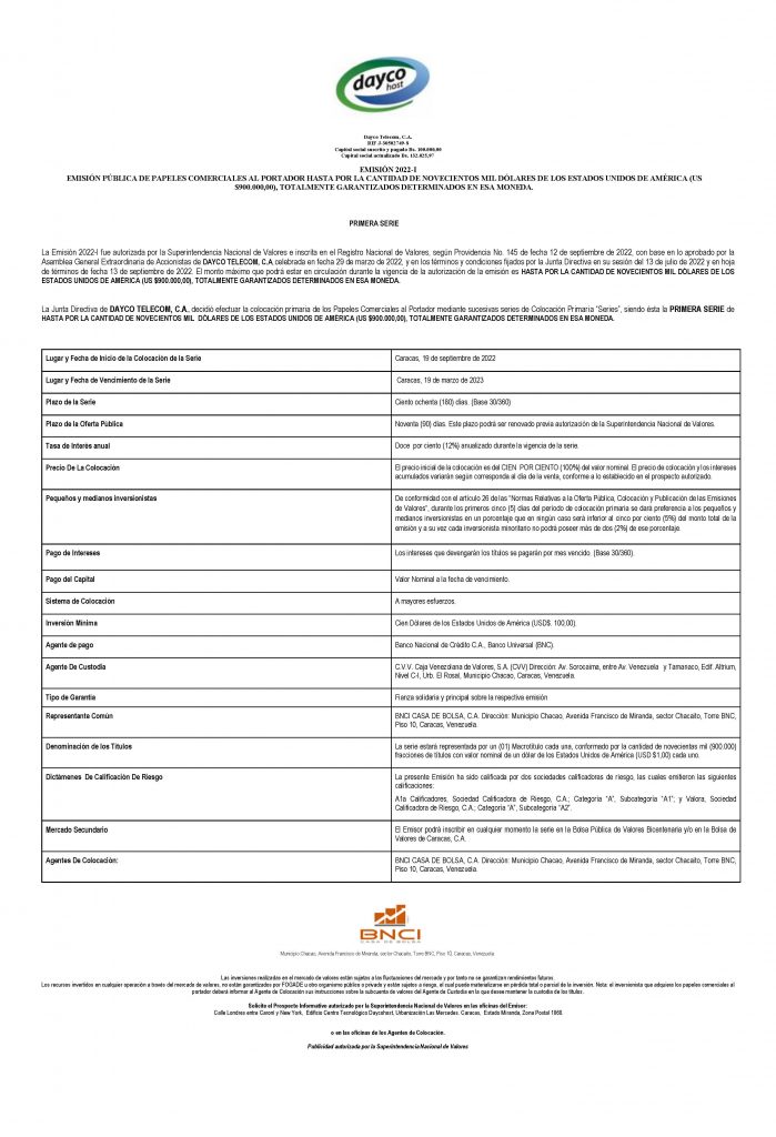 Los títulos para colocar son los correspondientes a la Serie I, de la Emisión 2022-I, de Papeles Comerciales de DAYCO TELECOM, C.A., con denominación en dólares de los Estados Unidos de América (USD$).