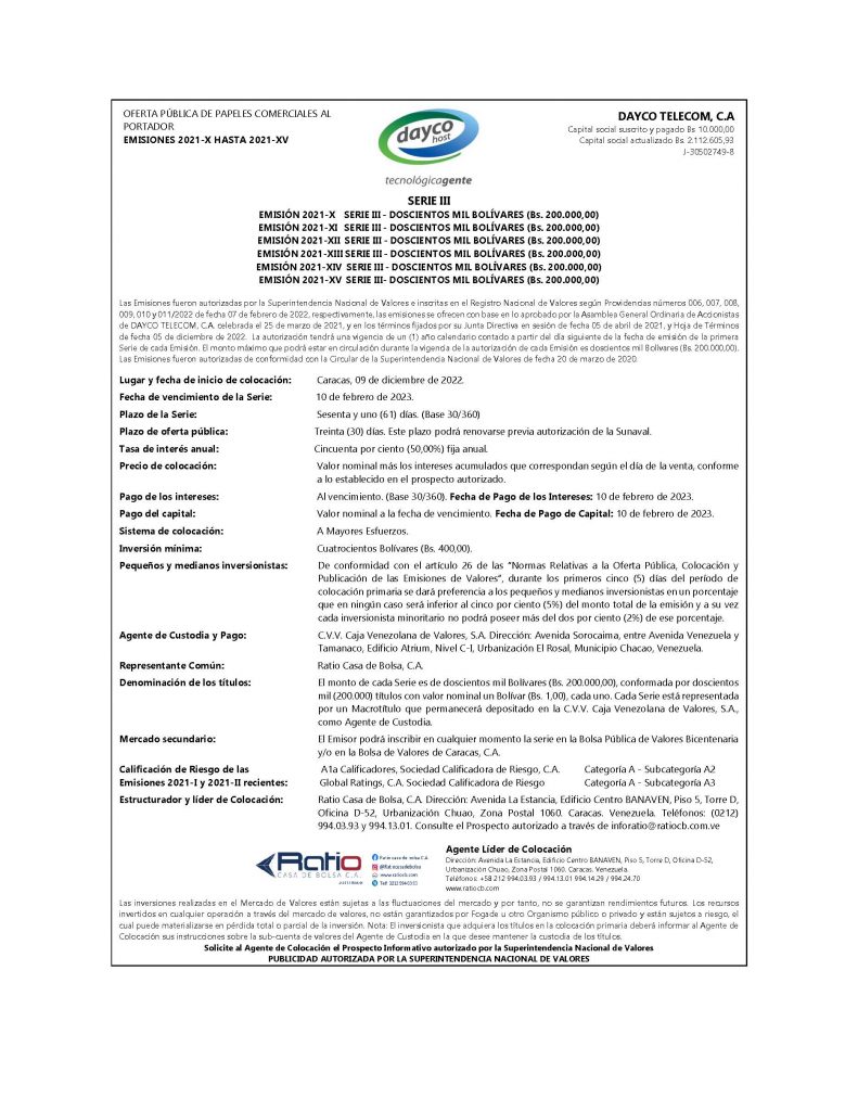 DAYCO TELECOM, C.A., EMISIONES 2021-X HASTA 2021-XV