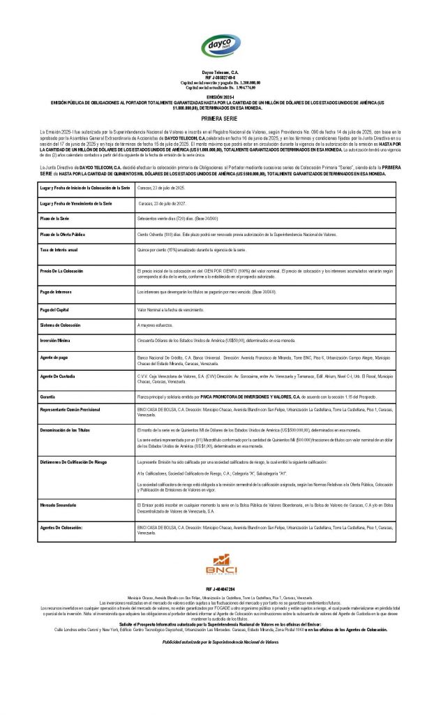 Los títulos para colocar son los correspondientes a la Serie I, de la Emisión 2025-I, de Obligaciones Al Portador Totalmente Garantizados de DAYCO TELECOM, C.A., con denominación en dólares de los Estados Unidos de América (USD$). Determinados en esa Moneda