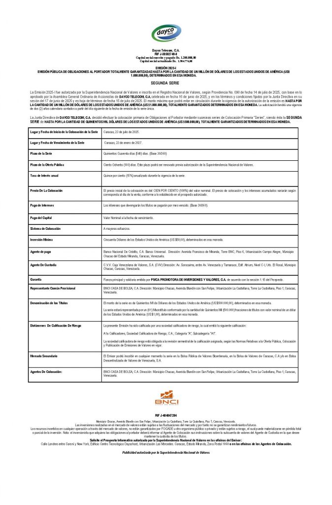 Los títulos para colocar son los correspondientes a la Serie II, de la Emisión 2025-I, de Obligaciones Al Portador Totalmente Garantizados de DAYCO TELECOM, C.A., con denominación en dólares de los Estados Unidos de América (USD$). Determinados en esa Moneda