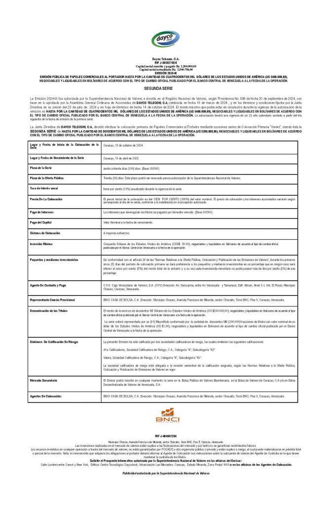 Los títulos para colocar son los correspondientes a la Serie II, de la Emisión 2024-III, de Papeles Comerciales de DAYCO TELECOM, C.A., con denominación en dólares de los Estados Unidos de América (USD$).