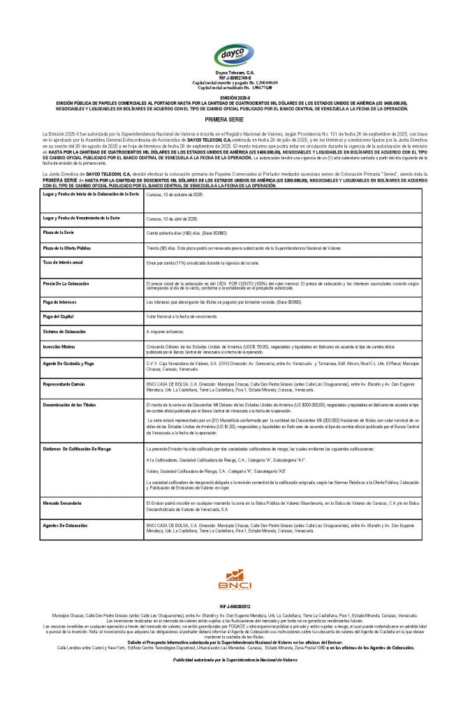 Los títulos para colocar son los correspondientes a la Serie I, de la Emisión 2025-II, de Papeles Comerciales de DAYCO TELECOM, C.A., con denominación en dólares de los Estados Unidos de América (USD$). Negociables y Liquidables en bolívares.