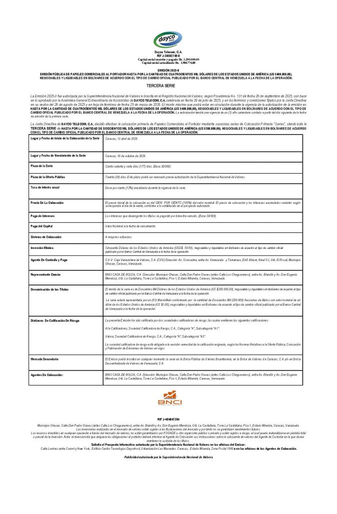 Los títulos para colocar son los correspondientes a la Serie III, de la Emisión 2025-II, de Papeles Comerciales de DAYCO TELECOM, C.A., con denominación en dólares de los Estados Unidos de América (USD$). Negociables y Liquidables en bolívares.