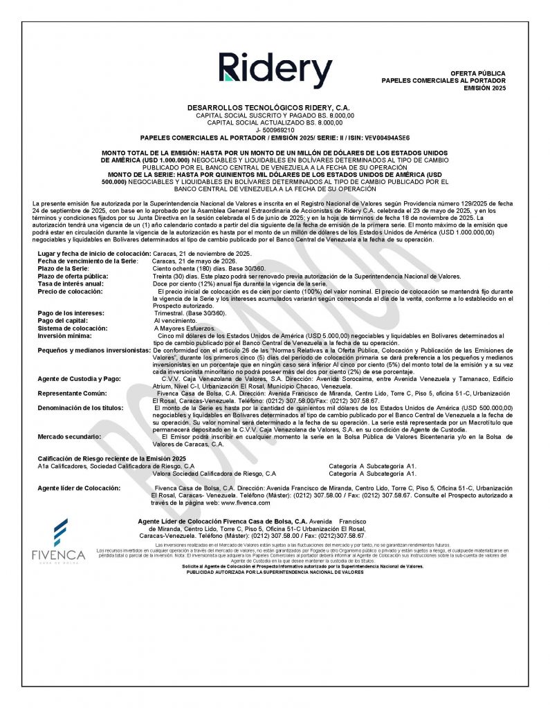 | Emisor | DESARROLLOS TECNOLOGICOS RIDERY, C.A. |