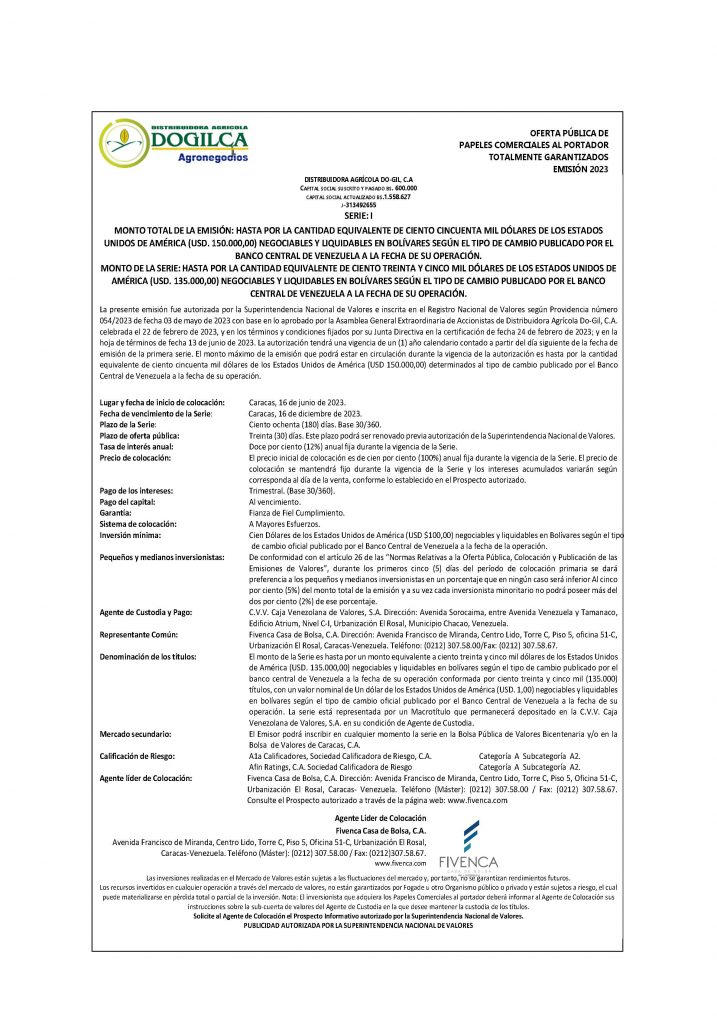 Colocación Primaria de Papeles Comerciales al Portador Totalmente Garantizados Emisión 2023 Serie I Monto USD. 135.000,00 NEGOCIABLES Y LIQUIDABLES EN BOLÍVARES SEGÚN EL TIPO DE CAMBIO PUBLICADO POR EL BANCO CENTRAL DE VENEZUELA A LA FECHA DE SU OPERACIÓN