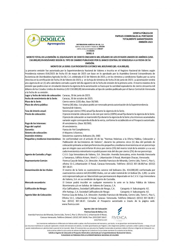 Los títulos para colocar son los correspondientes a la Serie II, de la Emisión 2023, de Papeles Comerciales de DISTRIBUIDORA AGRICOLA DO-GIL, C.A.
