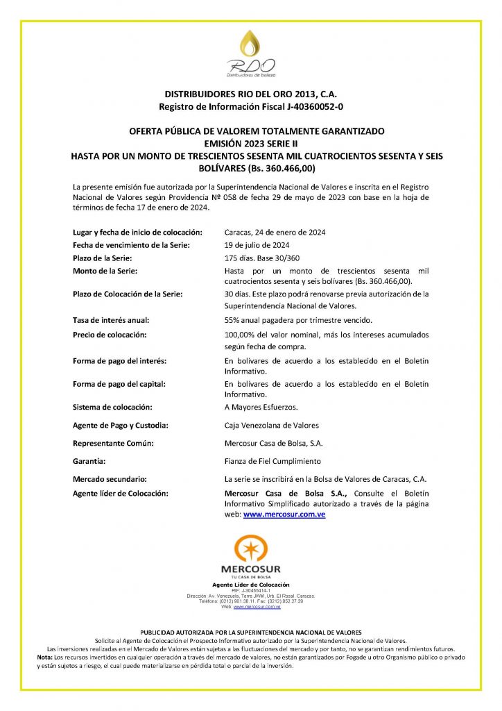 Los títulos para colocar son los correspondiente a la Serie II, de la Emisión 2023, de Valores de Emprendedores (VALOREM), de DISTRIBUIDORES RIO DEL ORO 2013, C.A., con denominación en bolívares.