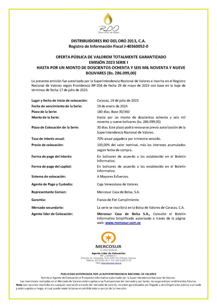 Los títulos para colocar son los correspondiente a la Serie 1, de la Emisión 2023, de Valores de Emprendedores (VALOREM), de DISTRIBUIDORES RIO DEL ORO 2013, C.A., con denominación en bolívares.