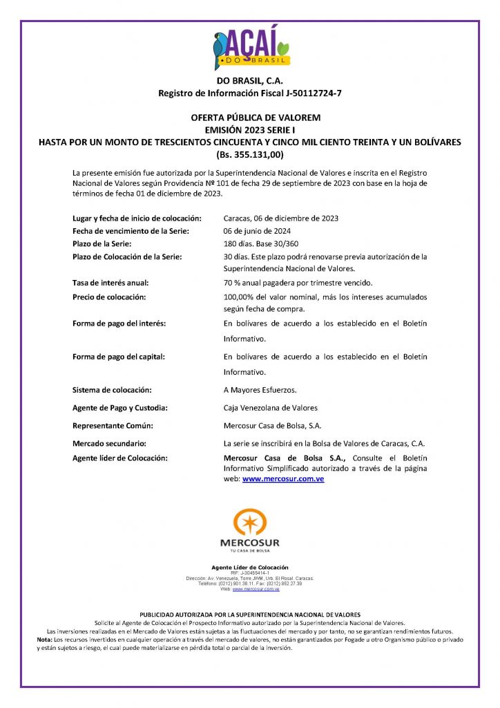 Los títulos para colocar son los correspondiente a la Serie I, de la Emisión 2023, de Valores de Emprendedores (VALOREM), de DO BRASIL, C.A.,con denominación en bolívares.
